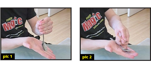 As you pretend to bend the spoon let the handle drop from the back of your hand. As the tip of the coin will still be show it will look like the spoon is bending (pic2). Pretend you are putting a lot of effort into it.